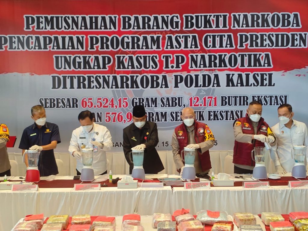 Kapolda Kalsel Irjen Pol Rosyanto Yudha Hermawan menyebutkan barang bukti yang dimusnahkan meliputi 65.524,15 gram sabu, 12.171 butir ekstasi dan 576.99 gram serbuk ekstasi.