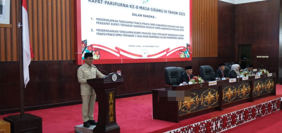 PURUK CAHU, suluhbanua.news – Suasana Rapat Paripurna ke-8 Masa Sidang III DPRD Murung Raya pada Senin (10/11/2025) terasa lebih intens dari biasanya. Di Ruang Rapat Paripurna yang penuh oleh unsur Forkopimda, anggota dewan, para kepala perangkat daerah, serta tokoh masyarakat, Bupati Murung Raya Heriyus tampil menyampaikan jawaban atas pemandangan umum fraksi-fraksi DPRD terhadap dua Rancangan Peraturan Daerah (Raperda) usulan Pemerintah Daerah.