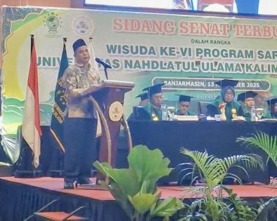 BANJARBARU, suluhbanua.news – Gubernur Kalimantan Selatan H. Muhidin melalui Asisten Administrasi Umum Setdaprov Kalsel, Dinansyah, menyampaikan ucapan selamat dan sukses kepada seluruh wisudawan dan wisudawati Universitas Nahdlatul Ulama (UNU) Kalimantan Selatan yang resmi menyandang gelar sarjana.